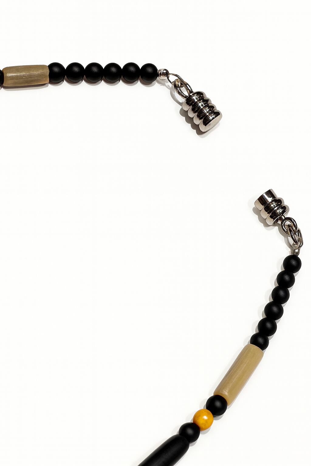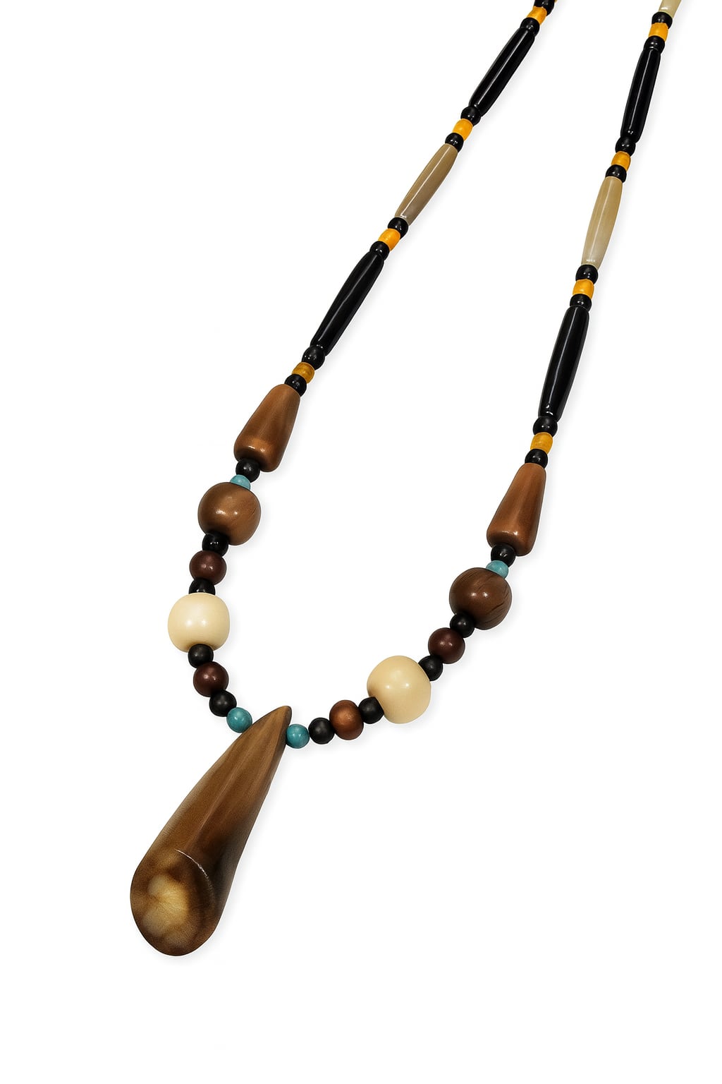 水牛の角先を中央に配置したエレガントなネックレスです。この美しいネックレスは、オニキスやターコイズの玉が組み合わさり、どんなコーディネートにも華やかさを添えます。